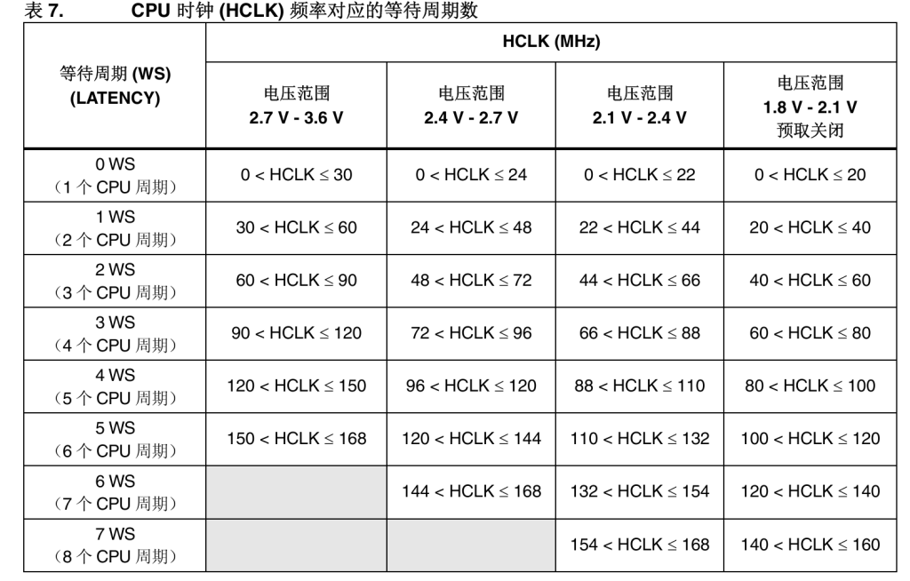 为了准确读取 Flash 数据,必须根据 CPU 时钟 (HCLK) 频率和器件电源电压在 Flash 存取控制寄存器 (FLASH_ACR) 中正确地编程等待周期数 (LATENCY)。