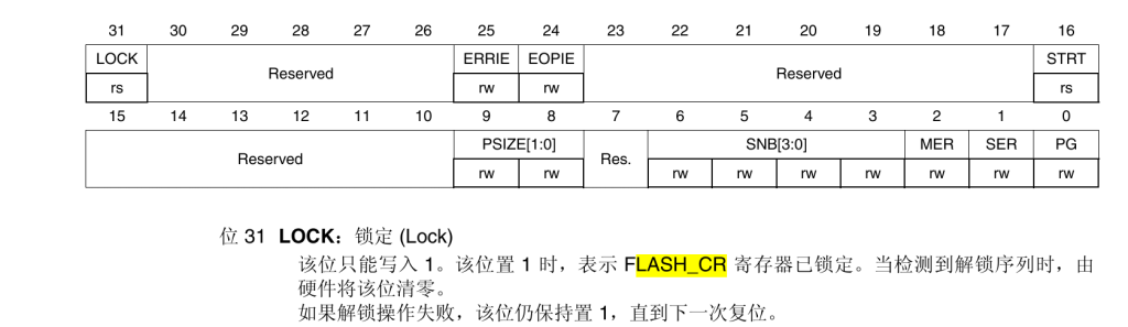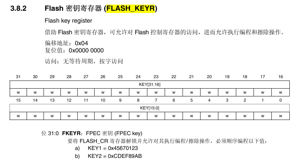 复位后,Flash 控制寄存器 (FLASH_CR) 不允许执行写操作,以防因电气干扰等原因出现对 Flash 的意外操作。此寄存器的解锁顺序如下: