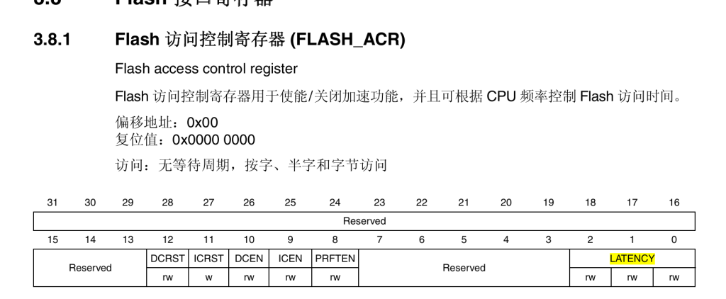 (1)将新的等待周期数编程到 FLASH_ACR 寄存器中的 LATENCY 位