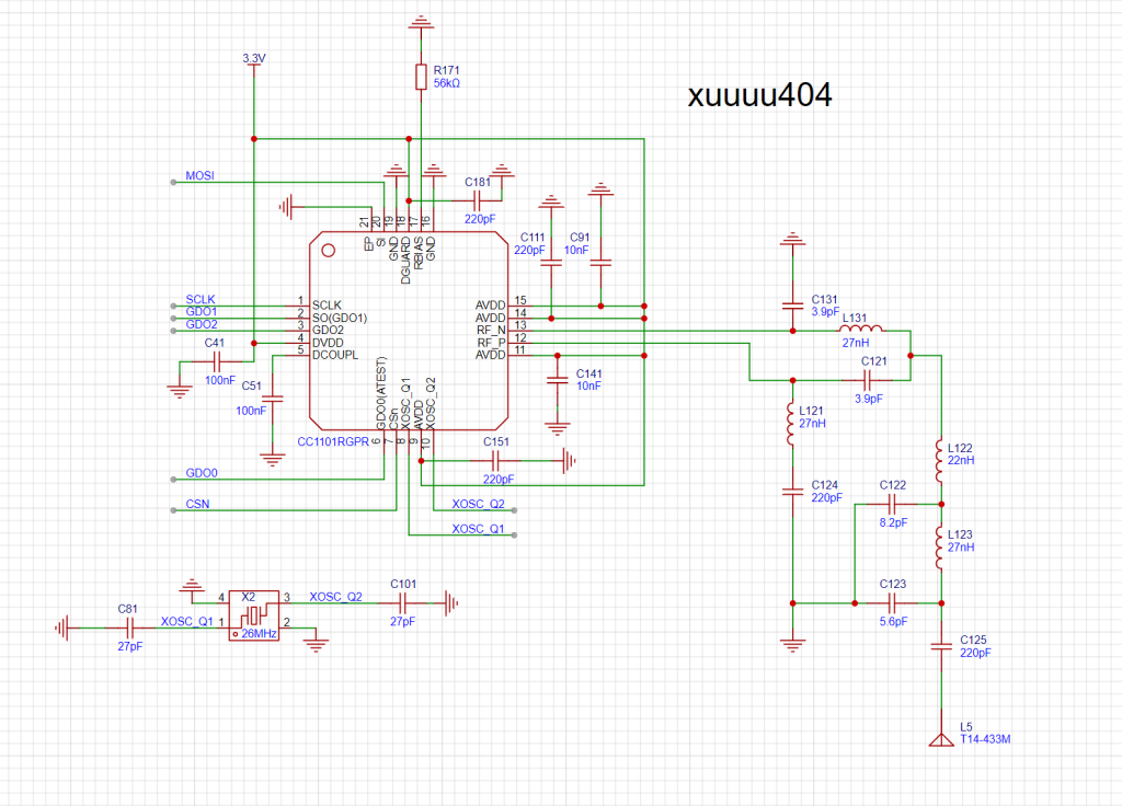 2、晶振电路问题:CC1101的晶振请使用四脚晶振(如3225)、如果是26Mhz 12pf的晶振,在负载电容请使用18pF