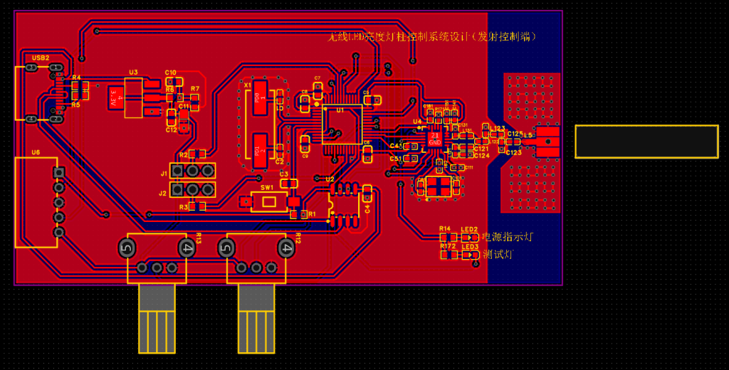 4、“共面波导”设计:在射频领域,当信号线的宽度、与旁边接地铜皮的距离以及介质厚度满足特定关系时,它就构成了一种叫做 “共面波导” 的传输线。(参考下面PCB的天线端设计)