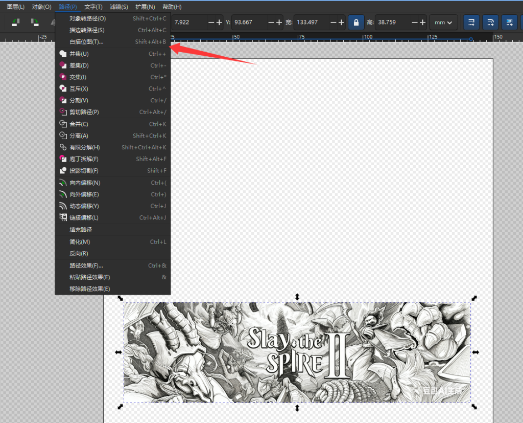 框选图片,在顶部选择路径——白描位图