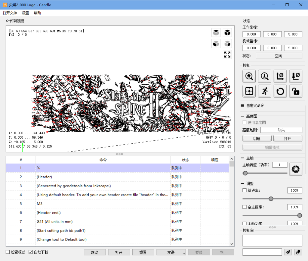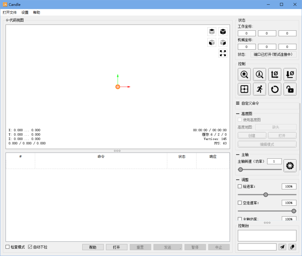 那么代码生成好后,下一步便是将代码发给写字机了。那么问题来了,代码这么多总不可能一条条手动发吧,这时候就要用到一些上位机软件了。CNC的上位机软件也有很多,像是Laser grbl(好像不支持STM32,仅auduino)等等,我这里使用的是Candle